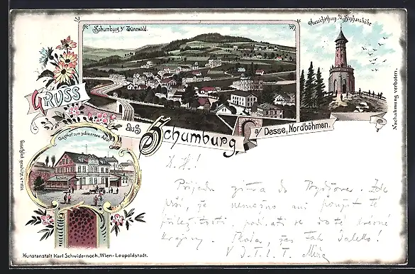 Lithographie Schumburg / Desse, Gesamtansicht, Aussichtsturm a. d. Stephanshöhe, Gasthof zum schwarzen Adler