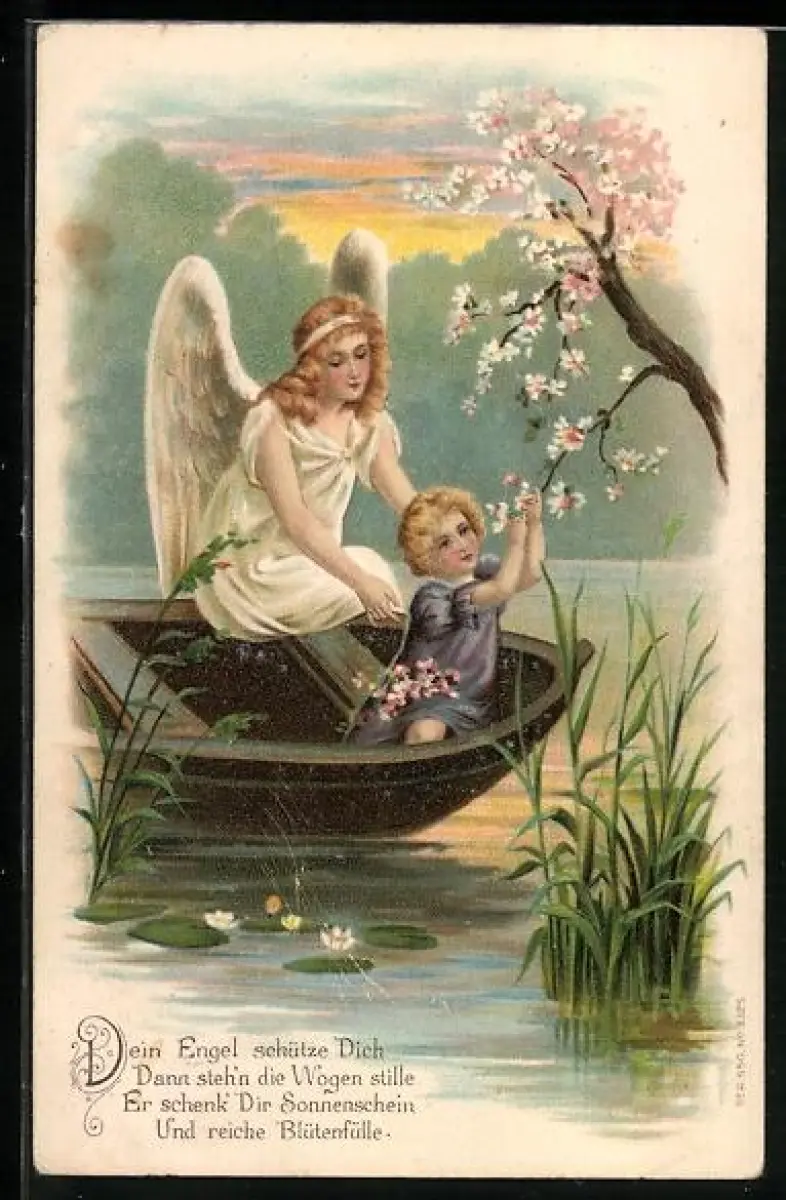 Lithographie Schutzengel, Kind in einem Boot pflückt Blüten