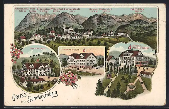 Lithographie Schwarzenberg, Gesamtansicht mit Schwarzflühli, Gummli, Esel, Pension Matt, Gasthaus Rössli
