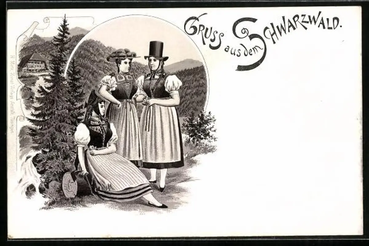 Lithographie Schwarzwald, Drei Damen in Schwarzwälder Tracht