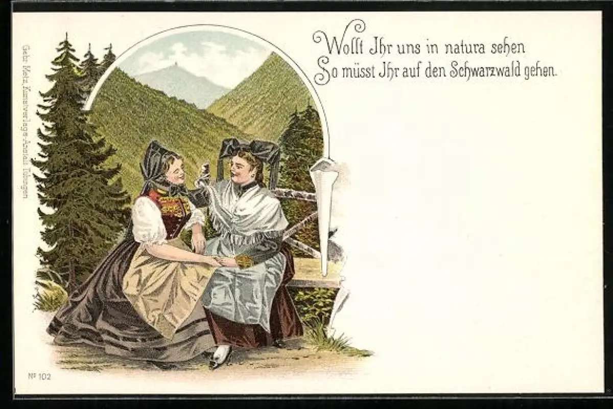 Lithographie Schwarzwald, Freundinnen in Trachten im Gespräch auf Waldbank