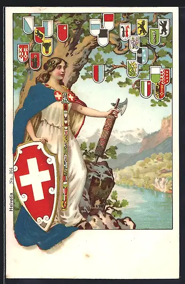 Lithographie Schweiz, Helvetia mit Kantonewappen