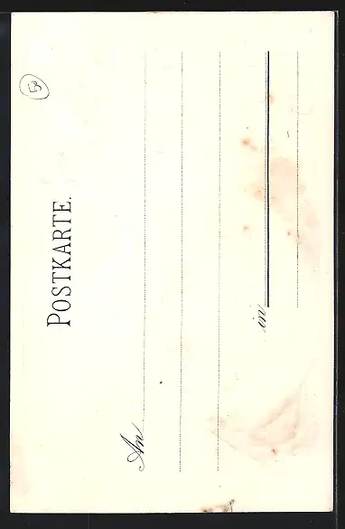 Personenbezogene Daten auf der Rückseite der Karte wurden durch blauen Textmarker unkenntlich gemacht. Die blauen Stellen sind auf die Vorderseite durchgeweicht und wirken sich negativ auf das Postkartenfoto aus