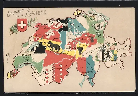 Lithographie Schweiz, Landkarte der Schweiz mit Kantonen
