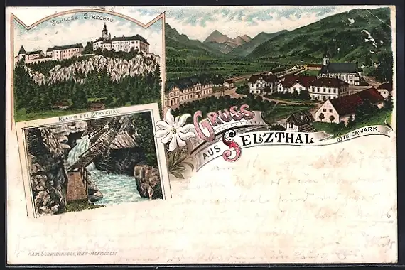 Lithographie Selzthal /Steiermark, Schloss Strechau, Klamm, Ortsansicht