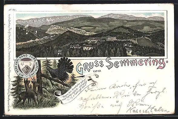 Lithographie Semmering, Ortsansicht mit gewaltigem Bergpanorama