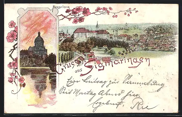 Lithographie Sigmaringen, Mausoleum im Abendlicht, Teilansicht