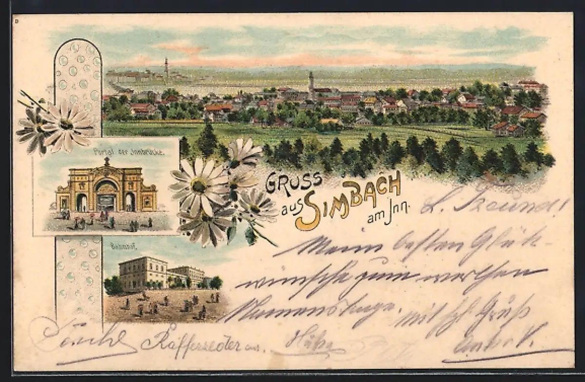 Lithographie Simbach a. Inn, Totalansicht aus der Vogelschau, Innbrücke, Bahnhof