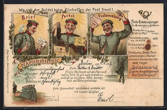 Lithographie Soldat bringt die Feldpost als Brief, Paket und Postanweisung