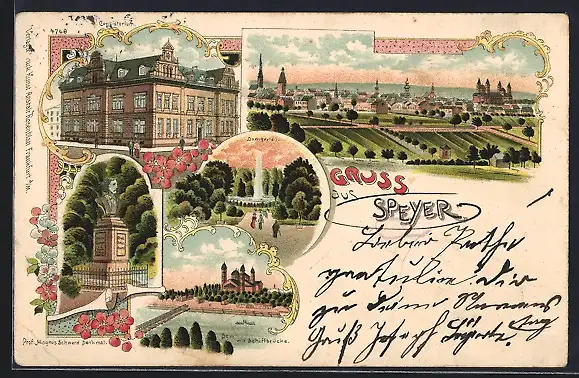 Lithographie Speyer, Consistorium, Domgarten, Schiffbrücke, Denkmal