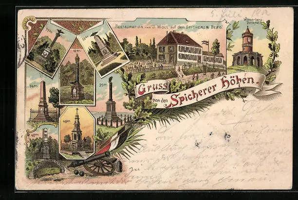 Lithographie Spicherer Höhen, Winterberg-Denkmal, Restauration von J. Woll auf dem Spichernberg