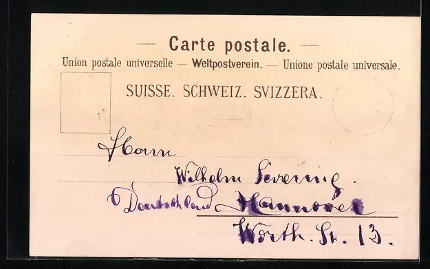 Personenbezogene Daten auf der Rückseite der Karte wurden durch blauen Textmarker unkenntlich gemacht. Die blauen Stellen sind auf die Vorderseite durchgeweicht und wirken sich negativ auf das Postkartenfoto aus