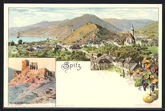 Lithographie Spitz, Ruine Hinterhaus, Panorama m. Kirche