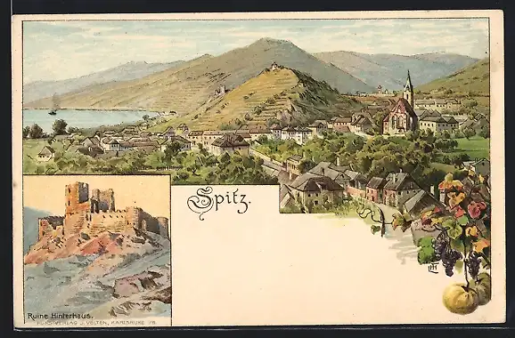 Lithographie Spitz, Ruine Hinterhaus, Teilansicht mit Kirche und Weinbergen