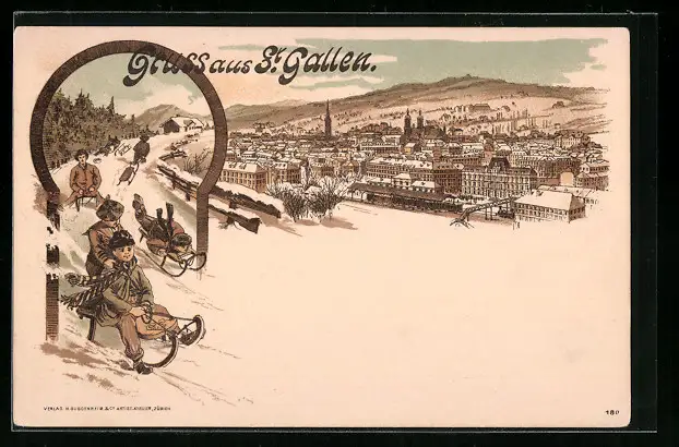 Lithographie St. Gallen, Ortsansicht mit Rodelbahn