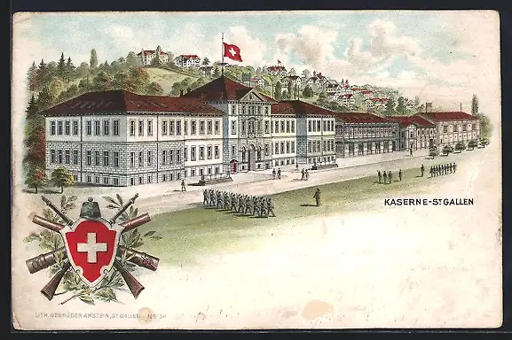 Lithographie St. Gallen, Partie an der Kaserne, Wappen