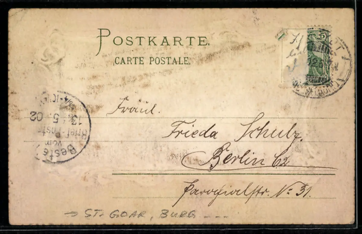 gelaufen 1902, Briefmarke entfernt, Eckknicke re. oben, guter Zustand