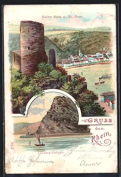 Lithographie St. Goar, Ortsansicht mit Ruine Katz, Loreley-Felsen