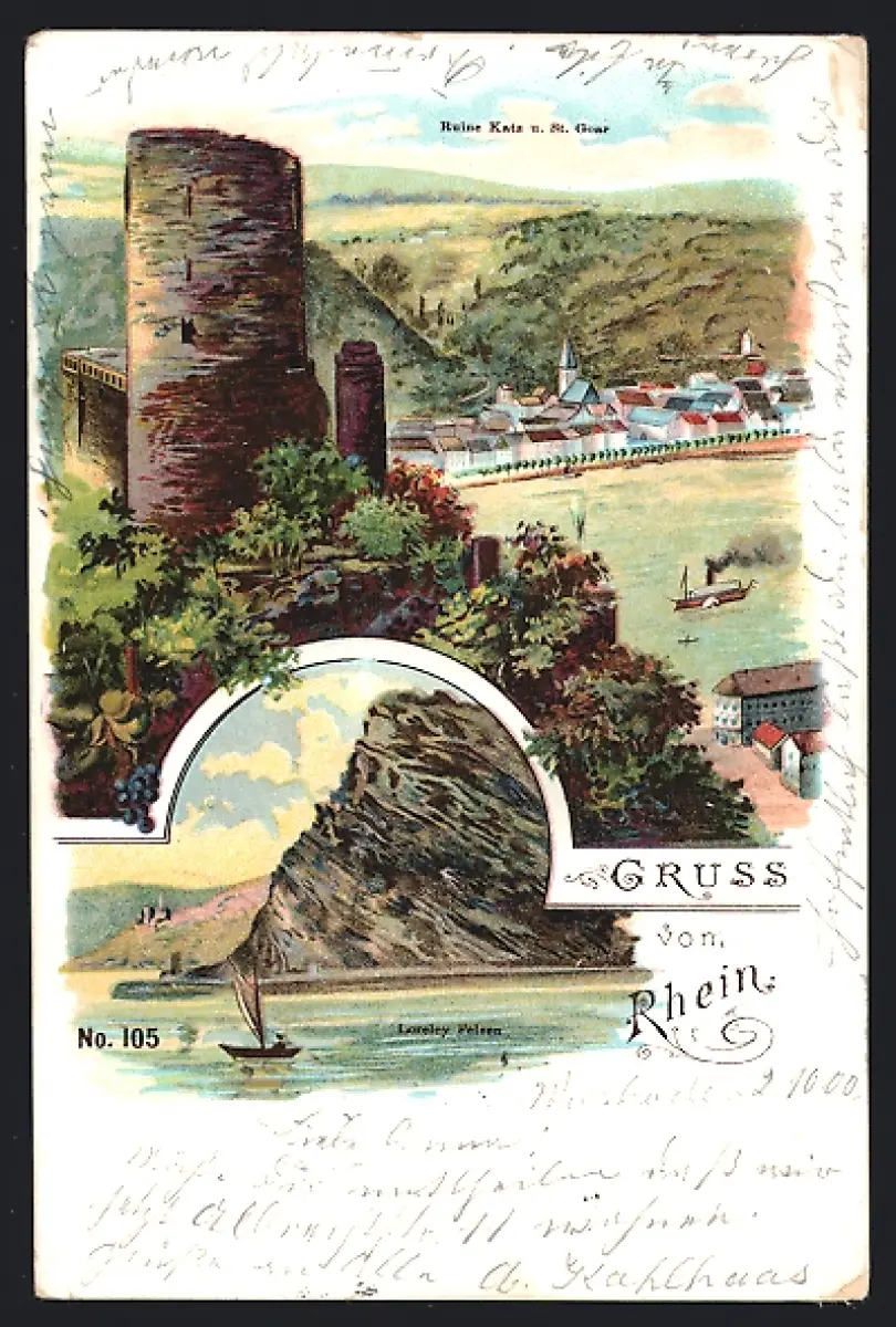 Lithographie St. Goar /Rhein, Ruine Katz, Loreley Felsen, Rheinansicht