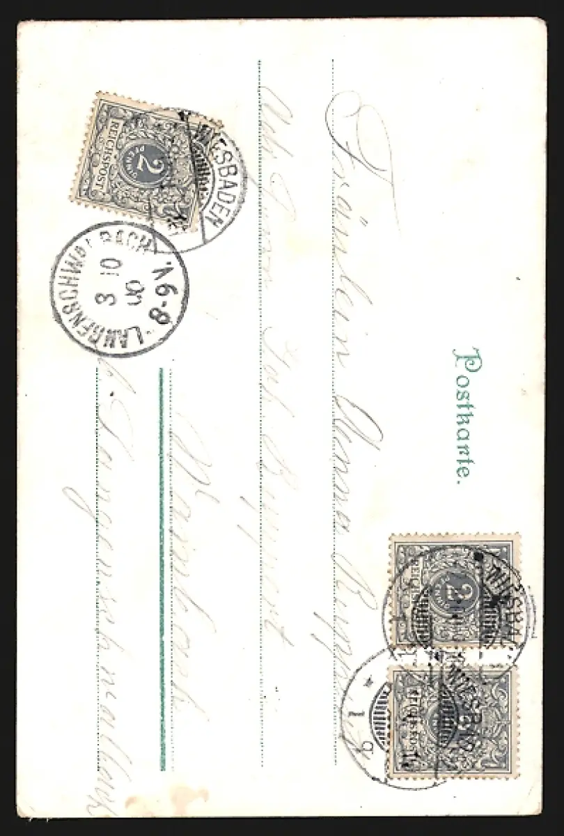 Personenbezogene Daten auf der Rückseite der Karte wurden durch blauen Textmarker unkenntlich gemacht. Die blauen Stellen sind auf die Vorderseite durchgeweicht und wirken sich negativ auf das Postkartenfoto aus