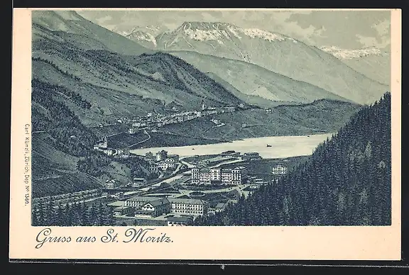 Lithographie St. Moritz, Ortsansicht mit Bergpanorama