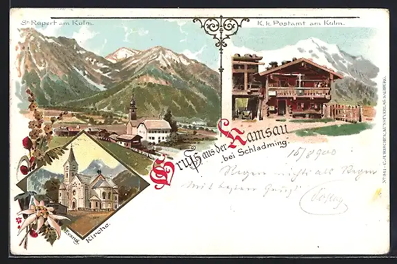 Lithographie St. Rupert am Kulm, Ortspartie mit Kirche, K. k. Postamt am Kulm, Evangelische Kirche