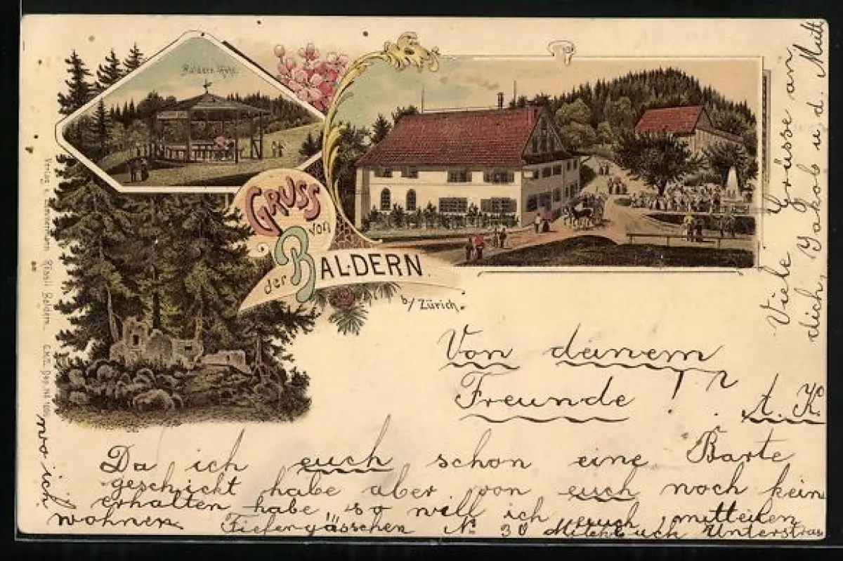 Lithographie Stallikon, Gruss von der Baldern, Gasthaus auf der Baldern-Höhe