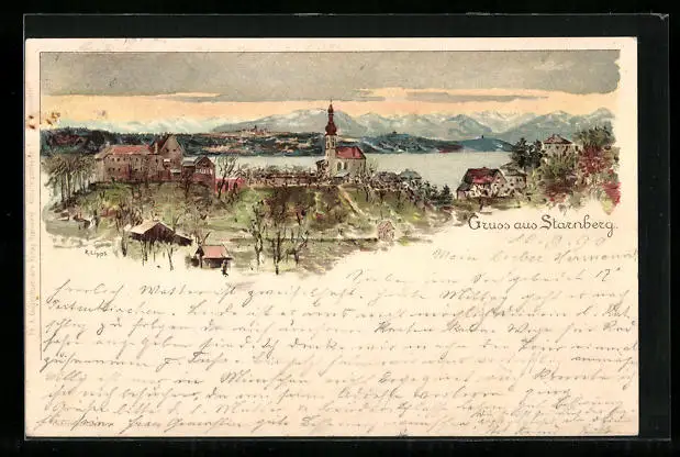 Lithographie Starnberg, Ortsansicht mit Kirche