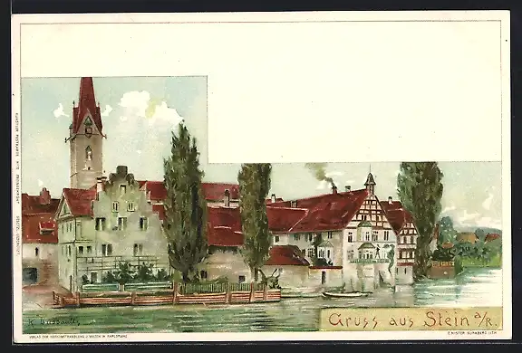 Lithographie Stein a. R., Gebäudepartie am Ufer