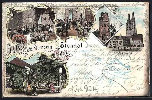 Lithographie Stendal, Café Sternberg, Uenglinger Thor und Marktplatz mit Rathaus Roland