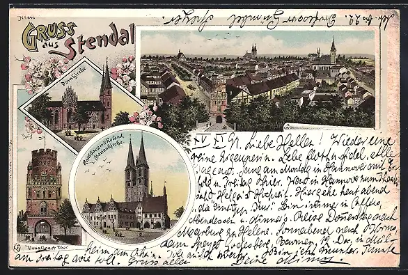 Lithographie Stendal, Rathaus mit Roland, Marienkirche, Domkirche, Venglinger Thor und Totalansicht