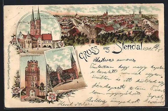 Lithographie Stendal, Rathaus mit Roland u. St. Mariankirche, Ünglinger Tor, Domkirche