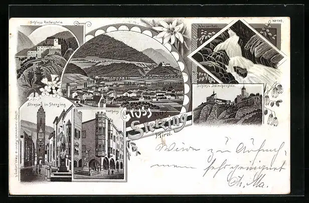 Lithographie Sterzing, Schloss Reifenstein, Rathaus, Wasserfall