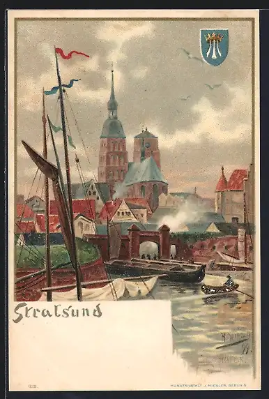 Lithographie Stralsund, Ortspartie mit dem Hafen