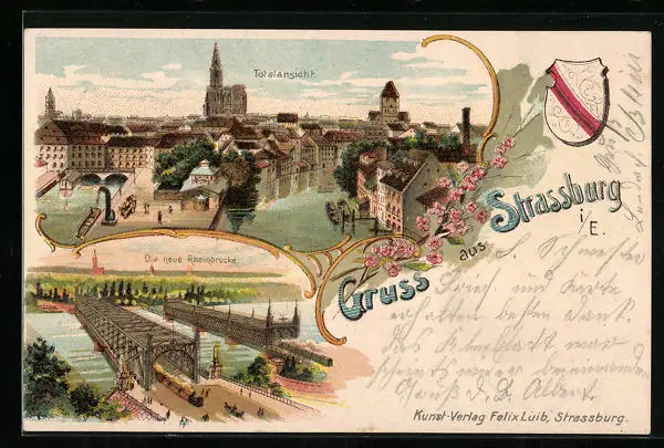 Lithographie Strassburg, Totalansicht, Neue Rheinbrücke, Wappen