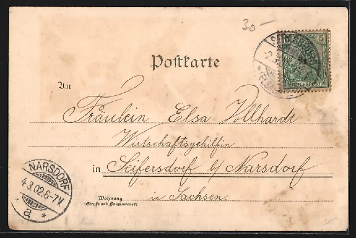 Personenbezogene Daten auf der Rückseite der Karte wurden durch blauen Textmarker unkenntlich gemacht. Die blauen Stellen sind auf die Vorderseite durchgeweicht und wirken sich negativ auf das Postkartenfoto aus