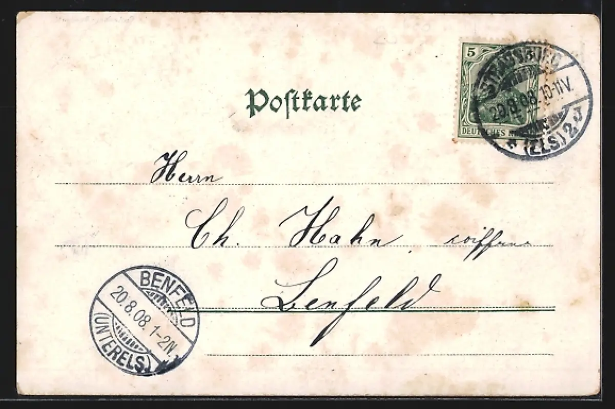 Personenbezogene Daten auf der Rückseite der Karte wurden durch blauen Textmarker unkenntlich gemacht. Die blauen Stellen sind auf die Vorderseite durchgeweicht und wirken sich negativ auf das Postkartenfoto aus