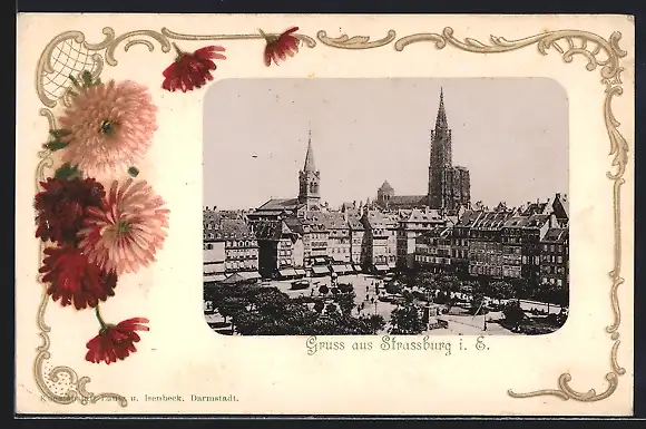Lithographie Strassburg i. E., Teilansicht aus der Vogelschau, Blumen
