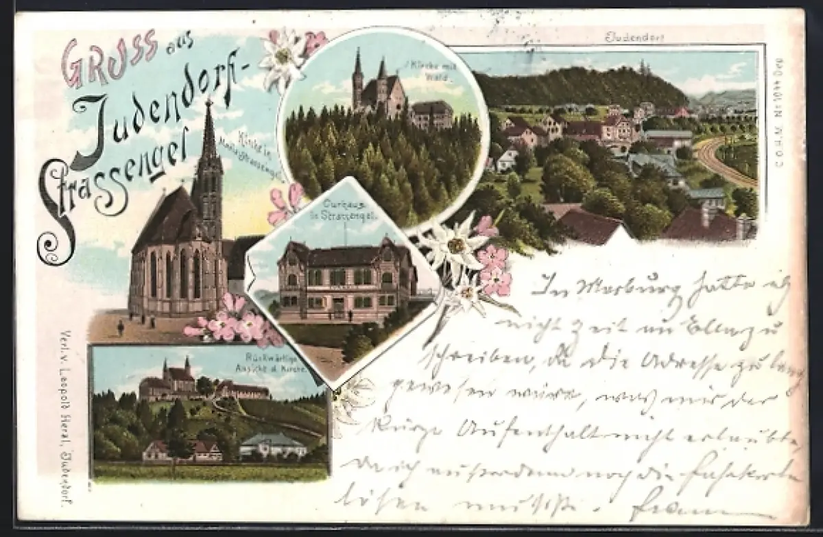 Lithographie Strassengel, Curhaus, Kirche im Wald, Blick über den Ort