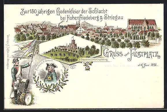 Lithographie Striegau, Festplatz zur Gedenkfeier der Schlacht, Siegehöhe b. Hohenfriedeberg