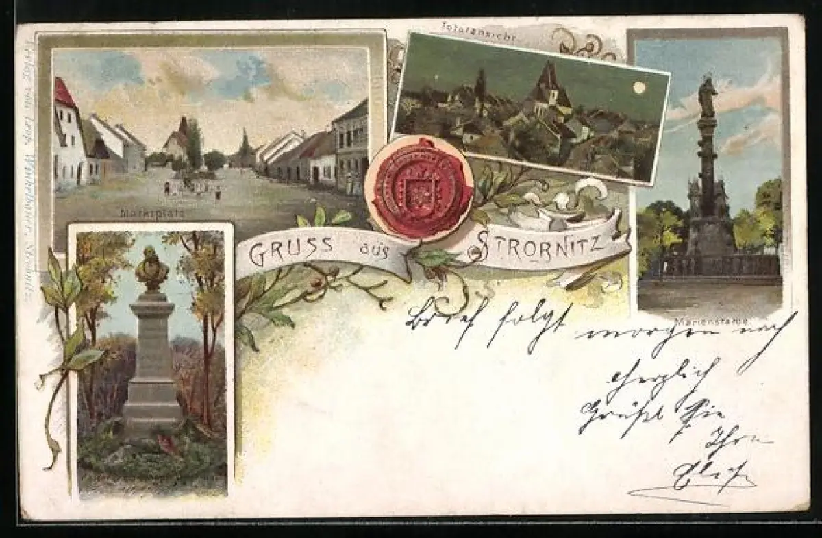 Lithographie Strobnitz, Marienstatue, Marktplatz, Kaiser Franz Josef Denkmal