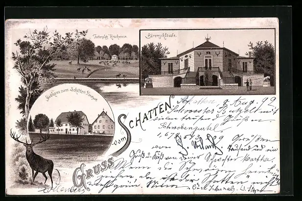 Lithographie Stuttgart, Gasthaus zum Schatten, Bärenschlössle, Hirschwiese