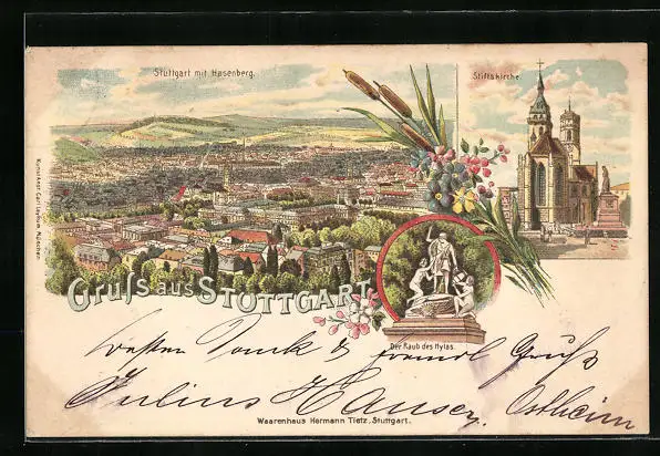 Lithographie Stuttgart, Gesamtansicht mit Hasenberg, Stiftskirche, Der Raub des Hylas