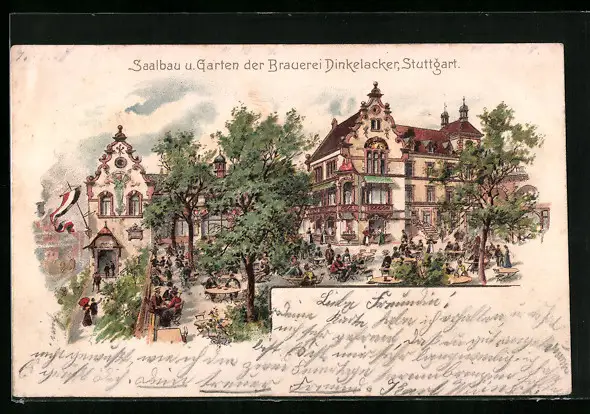 Lithographie Stuttgart, Saalbau und Garten der Brauerei Dinkelacker