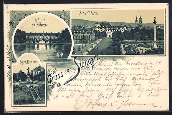 Lithographie Stuttgart, Schloss mit Anlagensee, Eugen Brunnen, Altes Schloss
