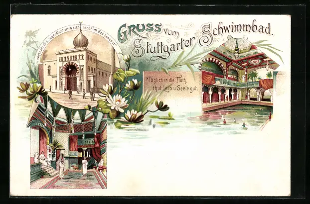 Lithographie Stuttgart, Schwimmbad, 3 Ansichte, Gedichte /Reime