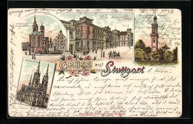 Lithographie Stuttgart, Stiftskirche, Post & Aussichtsturm Degerloch
