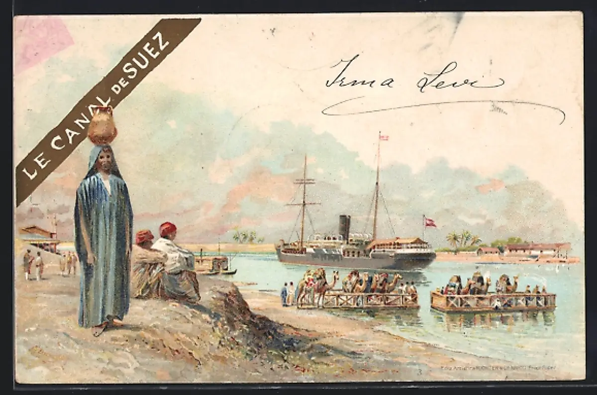 Lithographie Suez, Wasserträgerin vor Suezkanal mit Dampfschiff und Kamel-Flössen