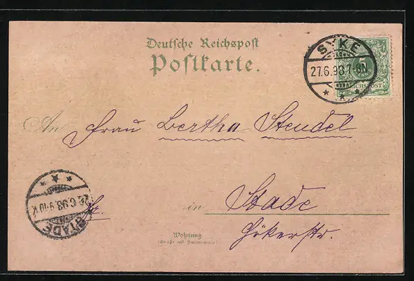 Personenbezogene Daten auf der Rückseite der Karte wurden durch blauen Textmarker unkenntlich gemacht. Die blauen Stellen sind auf die Vorderseite durchgeweicht und wirken sich negativ auf das Postkartenfoto aus