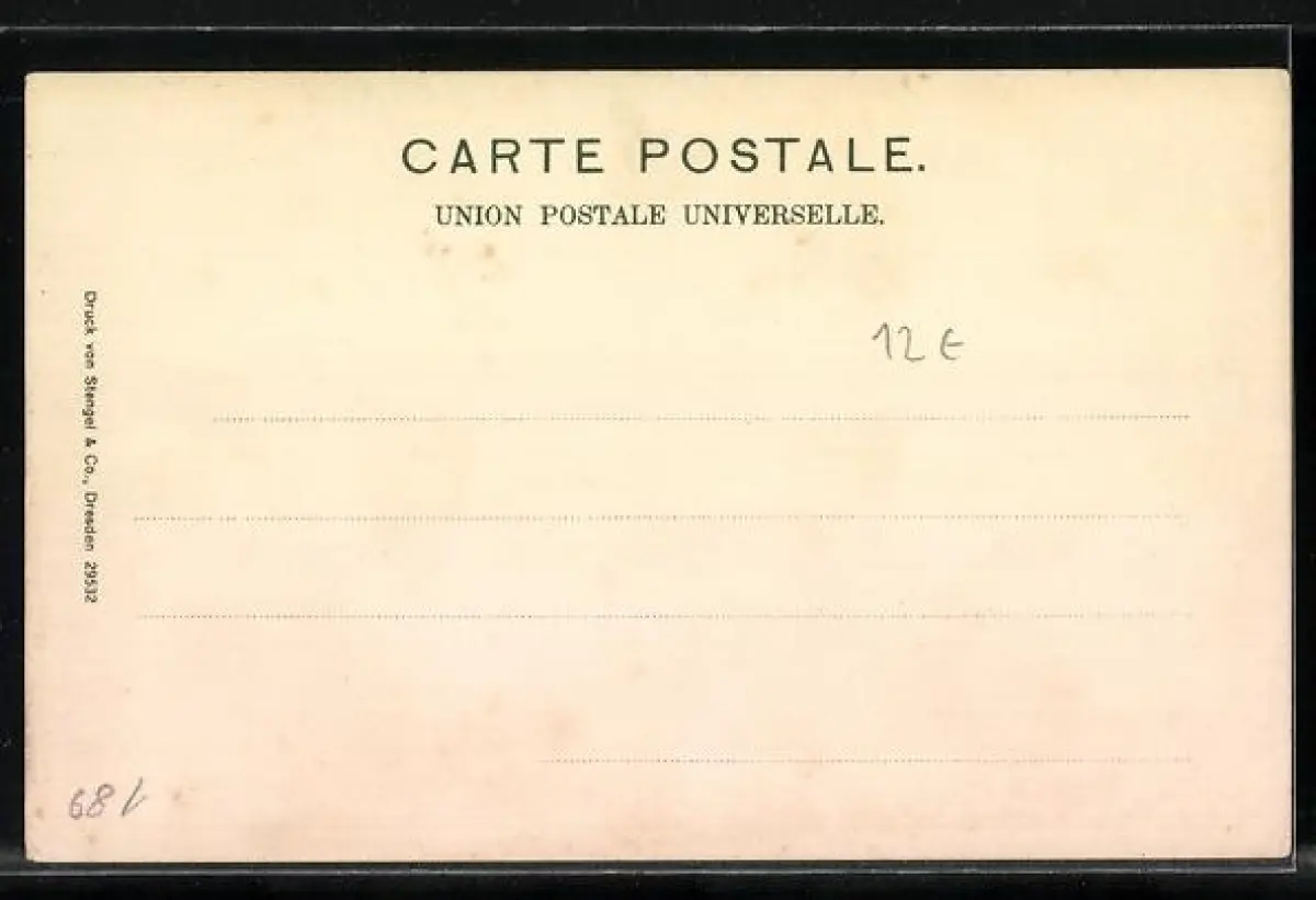 Personenbezogene Daten auf der Rückseite der Karte wurden durch blauen Textmarker unkenntlich gemacht. Die blauen Stellen sind auf die Vorderseite durchgeweicht und wirken sich negativ auf das Postkartenfoto aus